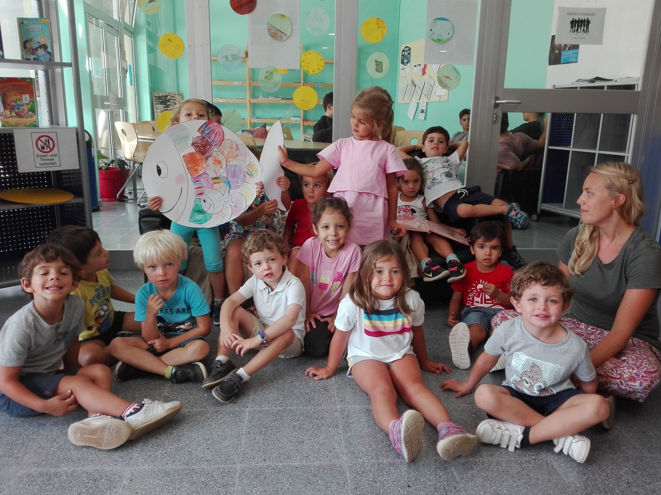 Der „kleine weiße Fisch“ in der Bibliothek Passend zum Thema „Regebogenfisch“ besucht die Gruppe des Kindergartens