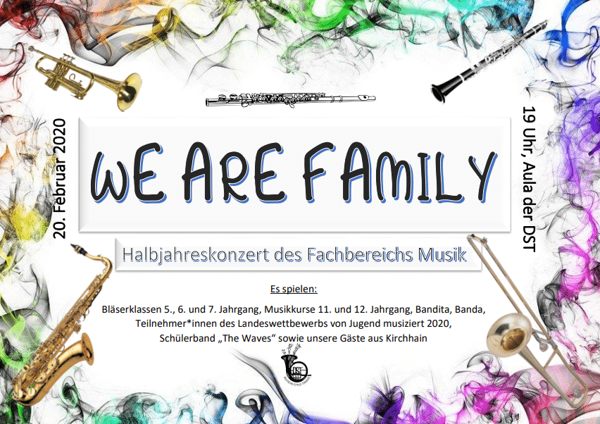 Am 20. Februar 2020 findet das Halbjahreskonzert des Fachbereichs Musik „We are Family“ um 19.00 in