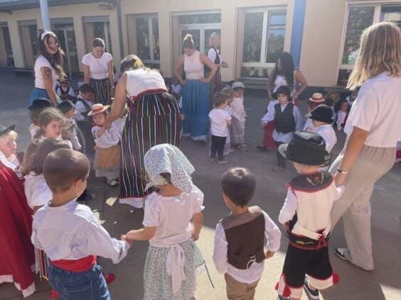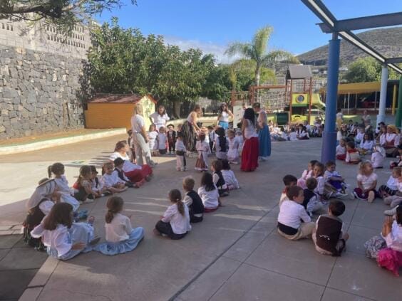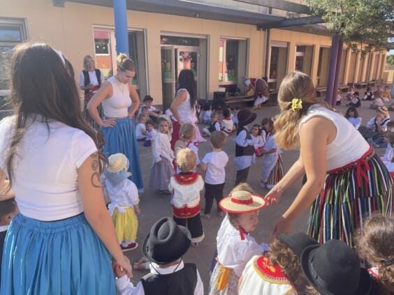 Anlässlich des „Día de Canarias“ fand am vergangenen Mittwoch, den 29. Mai, unser Schulfest statt. Nach einem typisch kanarischen Frühstück, das von den Familien der Schülerinnen und Schüler bereitgestellt wurde, versammelten sich alle Kinder von KiKri und Kindergarten auf dem Hof, um die Tänze aufzuführen, die sie in den Tagen zuvor geübt hatten. Unsere kleinsten, die Küken, Sonnen und Zwerge, überraschten uns mit dem Tanz „Die Spitze und die Ferse“, den sie für den gesamten Kindergarten aufführten. Anschließend tanzten und sangen die Kinder gemeinsam die typischen Lieder wie „Sieben Inseln“ und „Ich lebe in einem Archipel“. Wir beendeten diesen wunderbaren Tag in der Aula mit einer Aufführung von Güicho, die uns viel Spaß bereitete.