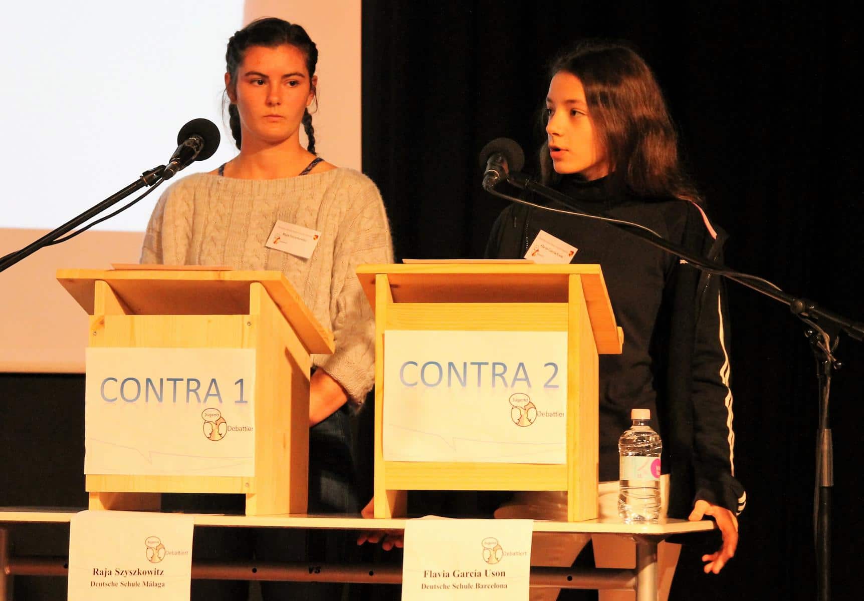 Am Tag zuvor hatten sich die Schülerinnen und Schüler aus Porto, Madrid, Bilbao, Las Palmas, Barcelona, Malaga, San Sebastian und Teneriffa niveauvolle Wortgefechte zu den Streitfragen „Sollte Werbung für ungesunde Lebensmittel verboten werden?“ und „Sollte der öffentliche Nahverkehr für alle kostenlos sein?“ geliefert. Da alle Schüler als Sieger ihrer jeweiligen Schulen angereist waren, gab es bei dem großen Finale keine Verlierer, sondern nur fröhliche Gesichter, die den Applaus der Zuschauer, Lob und Anerkennung für großartige Leistungen und ihre Auszeichnungen durch Honorarkosul Sr. Hernández entgegennahmen.