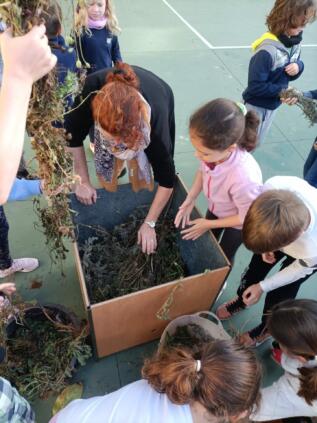 Die Klasse G3B und ihre Klassenlehrerin, Frau Degner, sind nun dabei, die Beete ordnungsgemäß zu befüllen und mit verschiedenen Gemüsen und Kräutern zu bepflanzen.