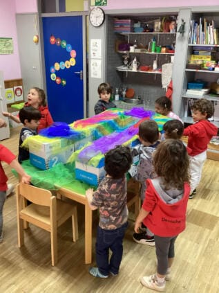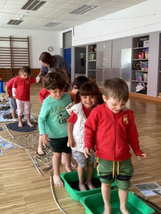 Im April haben unsere Praktikantinnen Pia-Sophie und Lydia zum Thema taktile Wahrnehmung gemeinsam mit den Kinder einen Barfusspfad gestaltet und entwickelt.