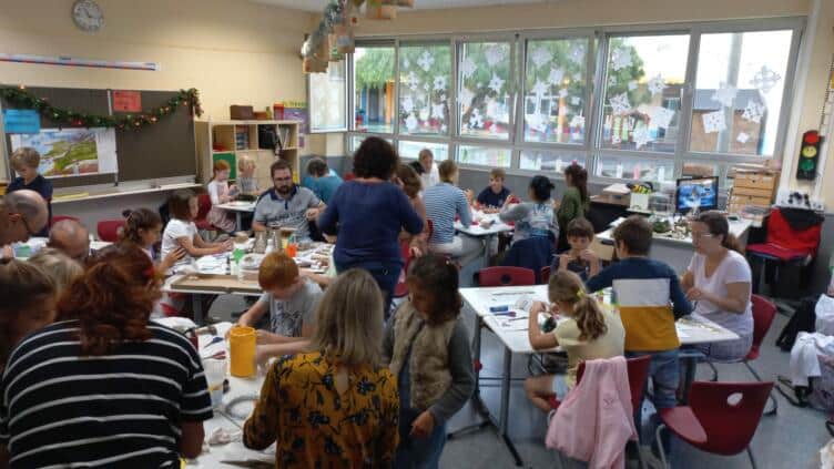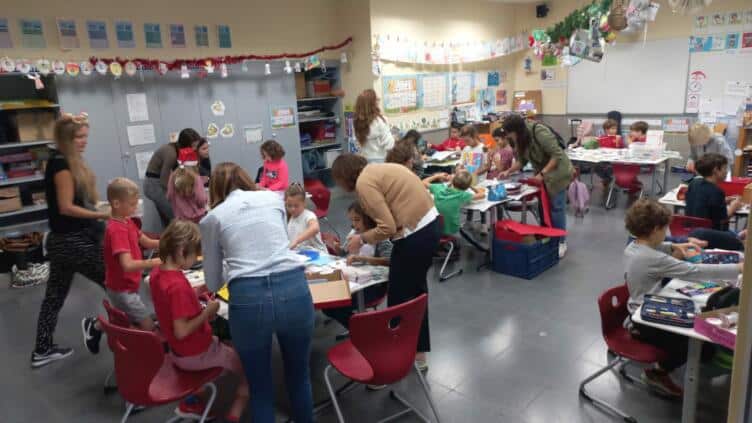 Mit Hilfe zahlreicher Eltern, die sich im Elterncafe bei Cafe und Kuchen stärken konnten, gelangen zahlreiche kleine weihnachtliche Kunstwerke, die zum Teil auch auf dem Weihnachtsmarkt der Schule, der am 21.12.2022 stattfindet, am Grundschulstand verkauft werden.