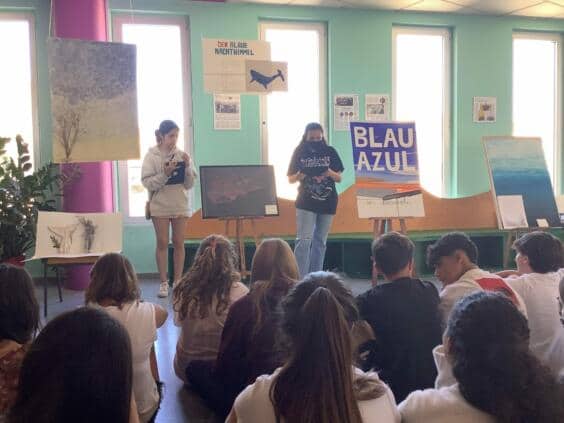 Las clases 9 a y b han hecho en las clases de alemán un proyecto de poesía sobre el tema «azul». Los alumnos tenían la tarea de escribir en grupos un poema con los recursos estilísticos que habían aprendido en clase. El segundo paso fue convertir su poema en un objeto artístico: un dibujo, una esculatura, un collage o una estructura más grande. Así surgió en la entrada del colegio un pequeño museo de estas obras de arte, resultado de mucho esfuerzo y creatividad.
