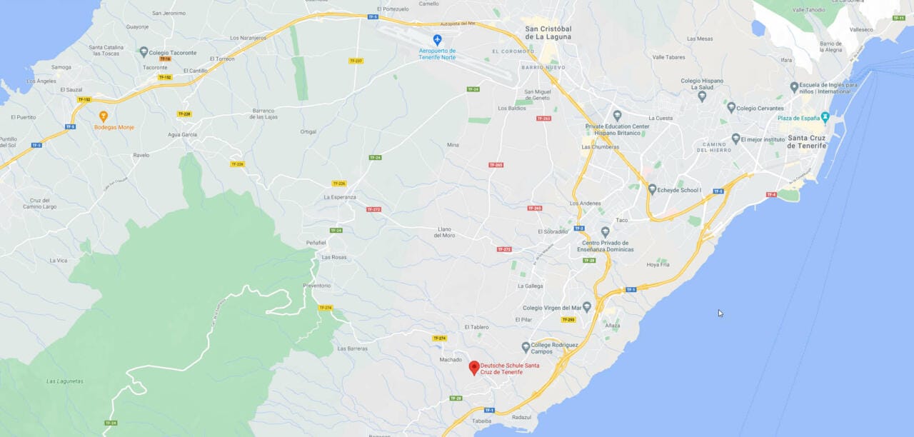 Salida 7 “Radazul” paralelo a la autopista. Posteriormente hay una rotonda. Completar la rotonda y abandonarla en dirección Radazul/Tabaiba. Continuar paralelo a la autopista y continuar por la carretera general cuesta arriba. Atravesar la TF28. A partir de aquí está señalizado el “Colegio Alemán”.