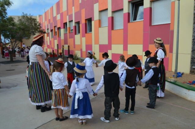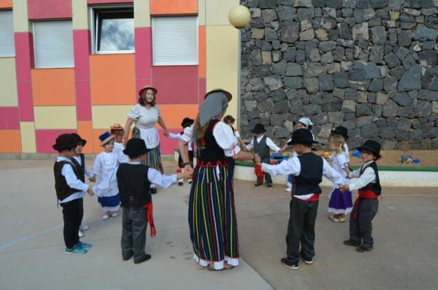 Estas últimas semanas las diferentes clases habían trabajado la historia, geografía y cultura canaria, lo que ha culminado en una gran fiesta en la que todos participaron en el patio del Kindergarten. Los más grandes, los niños de K3+, incluso hicieron, guiadas por sus maestras, el baile de las cintas.