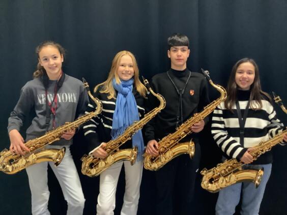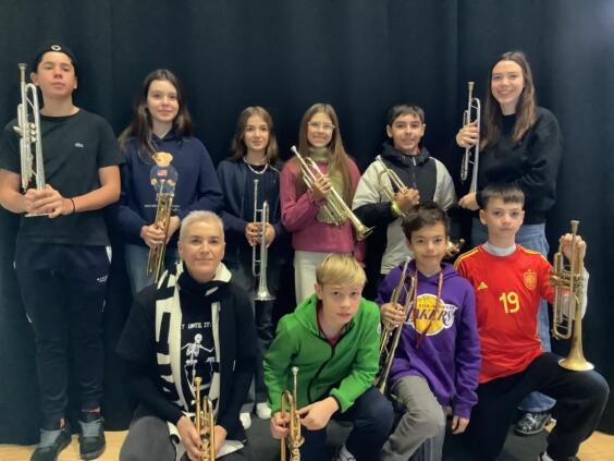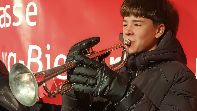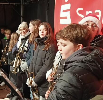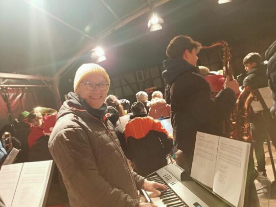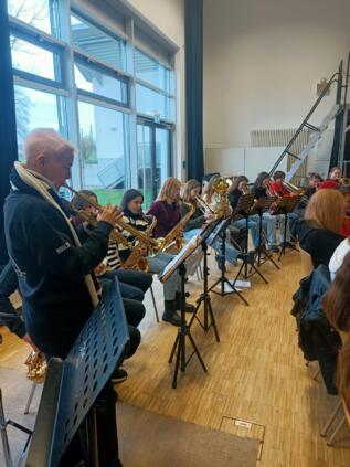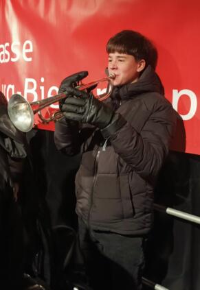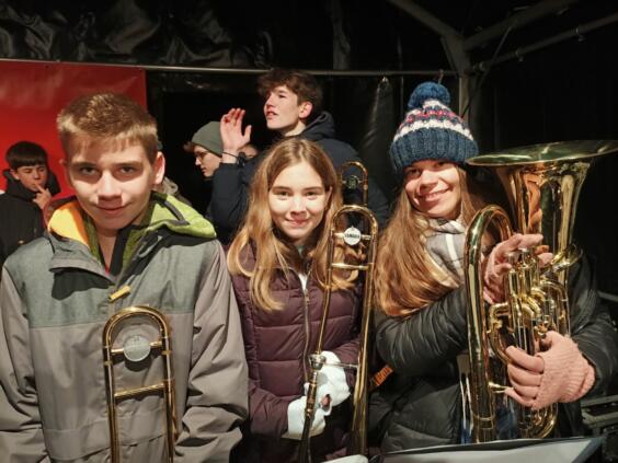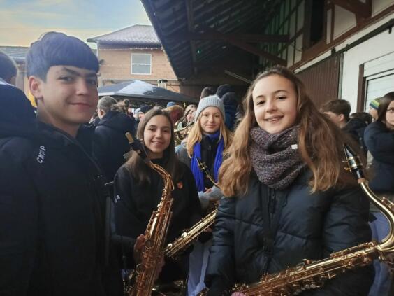 Por la noche, nuestras niñas y niños fueron recibidos calurosamente por las familias agochidas, a pesar de las temperaturas gélidas. Menos de diez horas después, ya estaban todos en el colegio listos para el primer ensayo conjunto. Junto con la Bläserklasse 6 y otros estudiantes del AWS, ensayaron villancicos para la presentación en el mercadillo de Großseelheim.