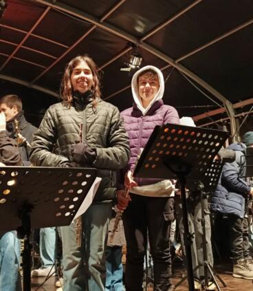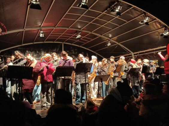 El sábado llegó el gran día: alrededor de 80 a 90 jóvenes músicos y músicas se reunieron en el mercadillo para ofrecer, en dos lugares distintos, un programa navideño animado de 30 minutos. Canciones como