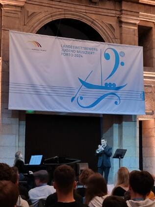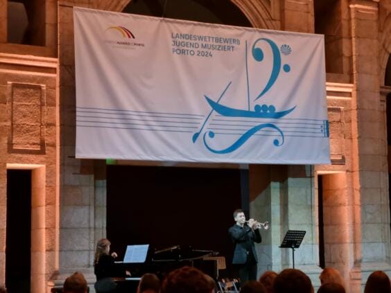 Guillermo representó a nuestra escuela con un solo de trompeta en el hermoso concierto de clausura en el Mosteiro de São Bento da Vitória, donde también estuvo presente la embajadora alemana en Porto. Pero más que los premios, nos alegra el paso que los estudiantes dieron hacia un escenario profesional, la dedicación a la música y la experiencia de una comunidad creativa que pudieron vivir en Porto.