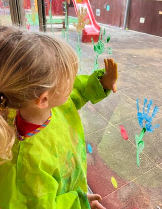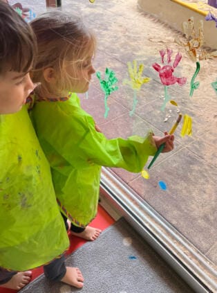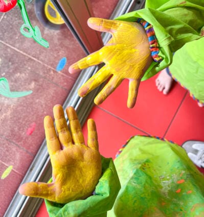 Las niñas y los niños participaron en la creación de una guirnalda de huellas de manos de colores con gran alegría y entusiasmo. A cada niña y cada niño se le permitió experimentar con los colores y contribuir con la huella de su propia mano; el resultado fue una decoración alegre y colorida que hizo visible la anticipación de la primavera.