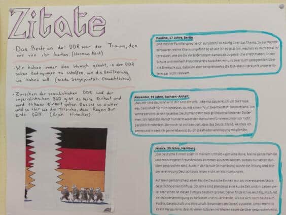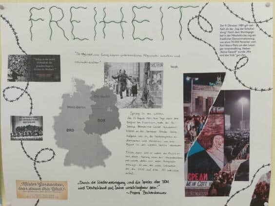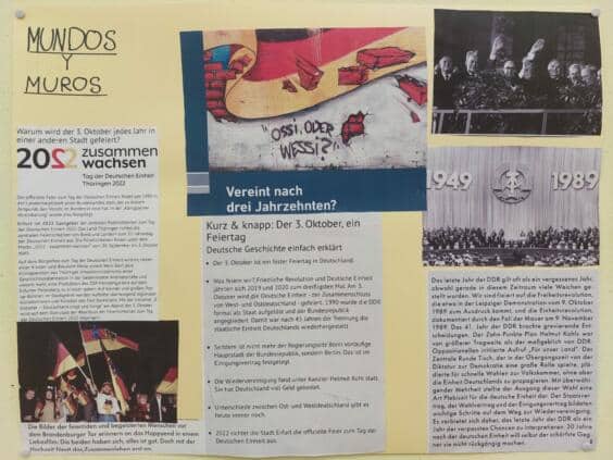 El 3 de octubre, en Alemania se celebra el Día de la Unidad Alemana y en el colegio hemos querido aprovechar la ocasión para realizar un día de proyecto con el título ,,Einheit und Begegnung – un mundo sin muros». Nos referimos a la antigua frontera alemana y al Muro de Berlín como símbolo de las fronteras y los muros en general. Todos los alumnos de las clases de G1 a 12 han trabajado en diversos proyectos a lo largo del día. Porque los muros, al igual que el muro de Berlín de entonces, no solamente pueden existir entre países, sino también entre grupos, ideas y personas. Ese ha sido nuestro tema en este día tan especial. Los profesores de todas las asignaturas y sectores del colegio han preparado pequeños y grandes proyectos: