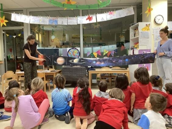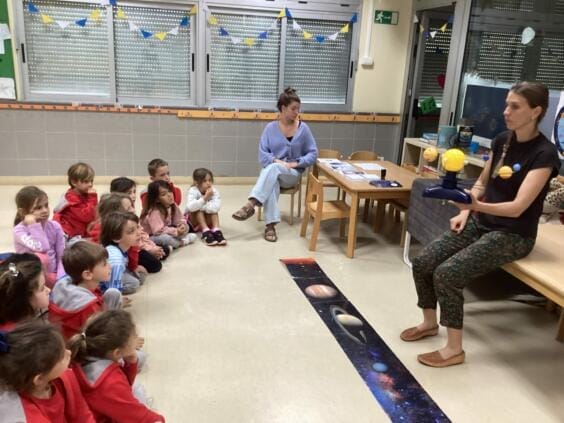 Presentó el tema a las niñas y los niños, que ya habían aprendido mucho sobre él en Ciencias Sociales, de forma animada e interactiva. Habló del sistema solar, las estrellas y los planetas, su tamaño y las distancias entre ellos. Y hubo muchas preguntas, así que el tiempo pasó volando.
