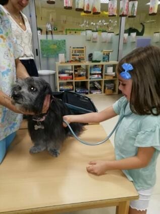Los niños y las niñas se turnaron para leer el microchip, examinar los oídos con un otoscopio y escuchar los latidos del corazón con un estetoscopio.
