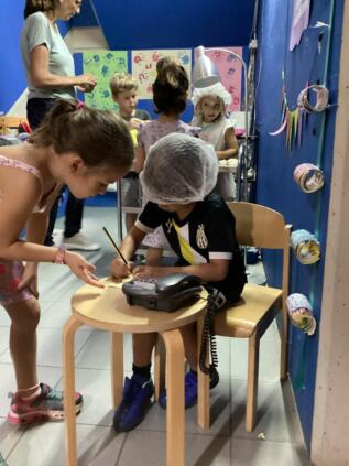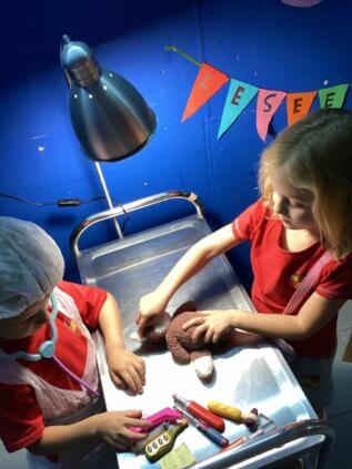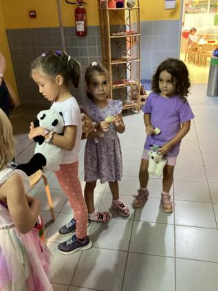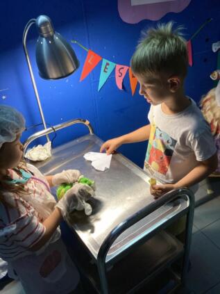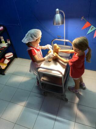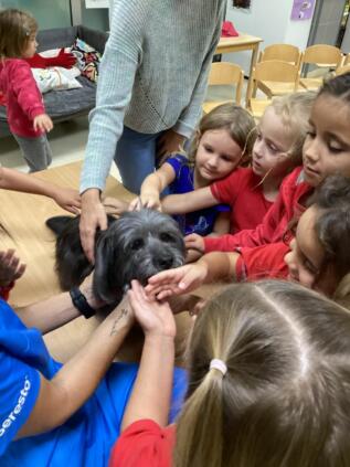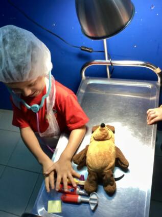 A continuación, en el círculo de la mañana, se introdujo en alemán el vocabulario sobre el tema «práctica veterinaria». Una consulta veterinaria improvisada dará a los niños la oportunidad de consolidar el vocabulario aprendido mediante juegos de rol.