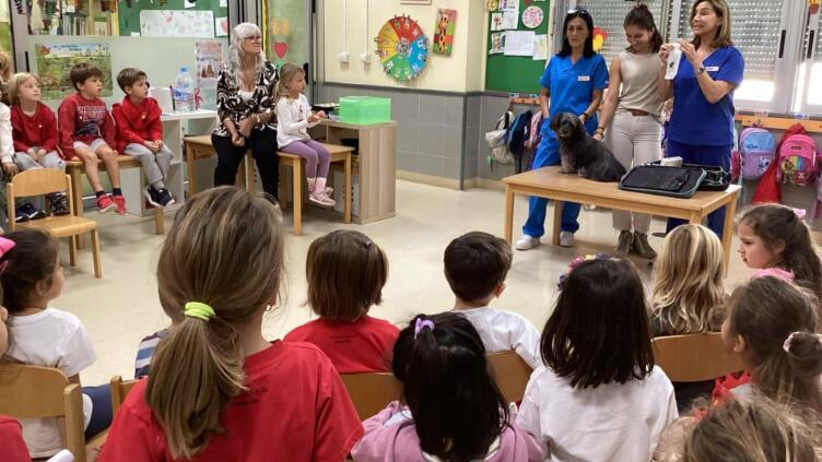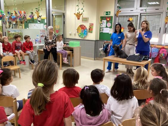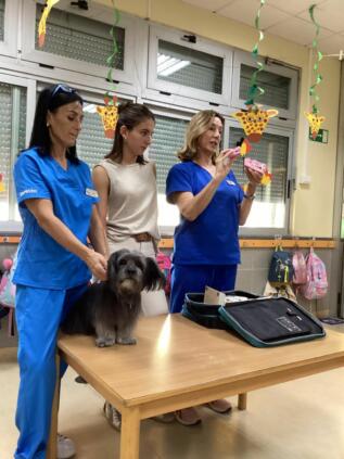 Como el año pasado, una vez más tuvimos la suerte de recibir a la veterinaria Isabel Pascua (Clínica Veterinaria Radazul) en el aula de K3+. Junto con su ayudante y un paciente vivo (el perro «Quin»), habló de su trabajo como veterinaria.