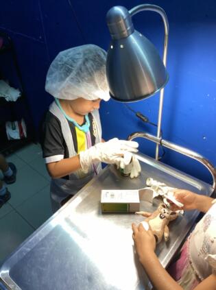 Los niños se turnaron para leer el microchip, examinar los oídos con un otoscopio y escuchar los latidos del corazón con un estetoscopio.